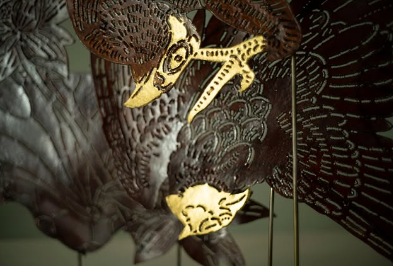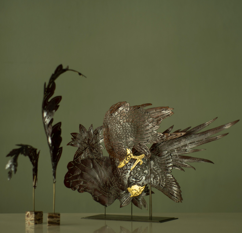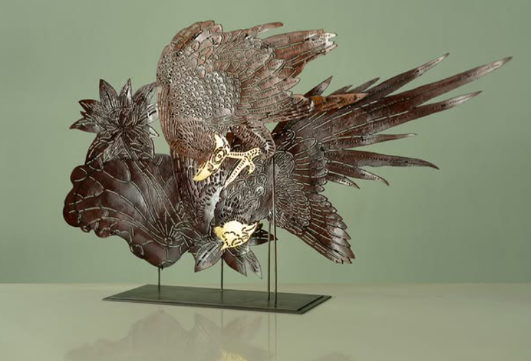 A symbolic leather sculpture narrating the interplay of justice, beauty, and peace through the imagery of a hawk, a pheasant, and a lotus marsh.