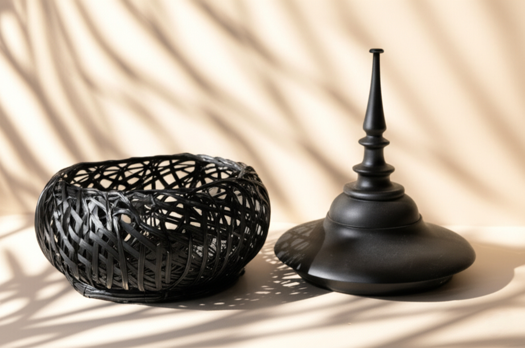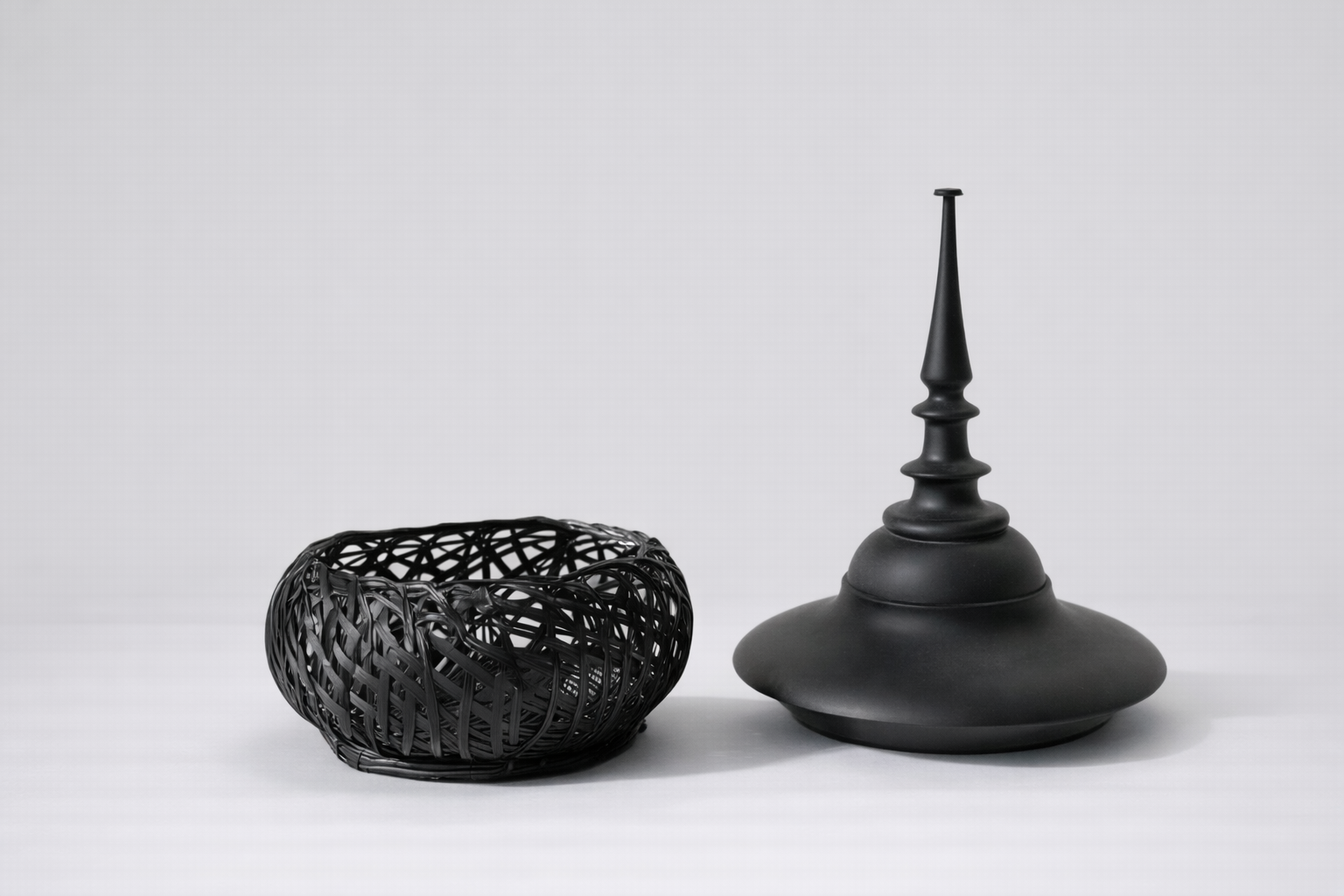 “Moh-Than” is an art of weaving from big bamboo strips, practices on the coast lineof Thailand. The bamboo container combines with a Lathed Wood lid in geometrical shape, create a stunning luxury and elegant form. A rare weaving technique and elegant wood lid has become a combination of both artistic and functionality, a collectible design object.