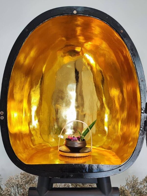 This work reinterprets the traditional Thai art of Nang Yai leather carving through a contemporary functional design. Drawing inspiration from ancient Lai Rod Nam (gold lacquer) motifs—particularly intricate floral and foliage patterns—the piece translates these ornamental forms into a refined surface language. The delicate perforation and carving techniques, historically used to create narrative shadow figures, are adapted to emphasize texture, light, and shadow on a three-dimensional object.