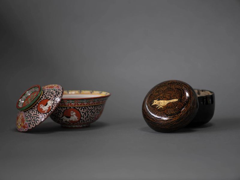 Handwoven bamboo structure, lathed wood lid, lacquer (Urushi),