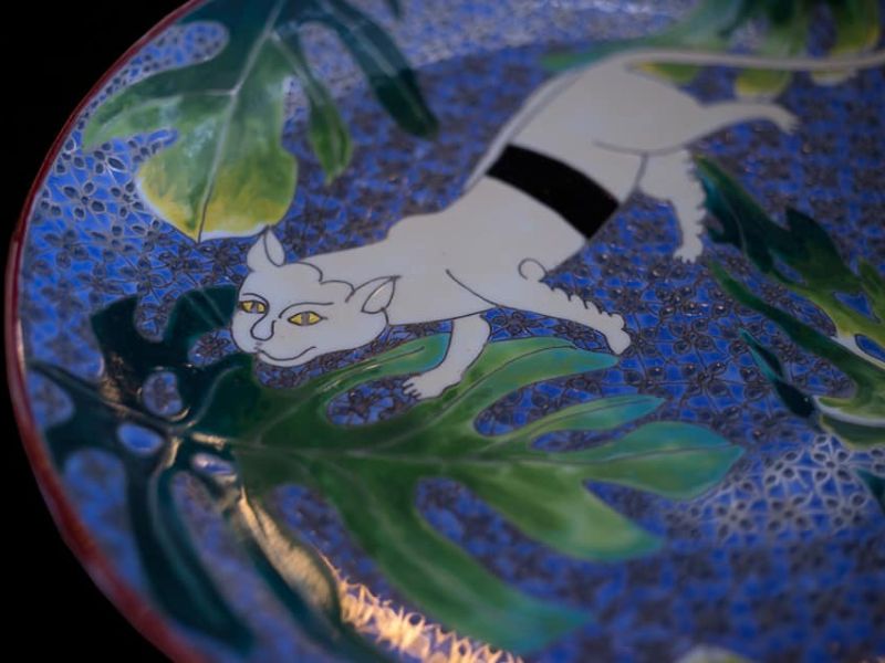 The imagery derives from illustrations of seventeen auspicious Siamese cat breeds recorded in traditional Thai folding manuscripts. The motifs are rendered using the Benjarong overglaze enamel technique, in which each color is applied and kiln-fired separately, producing luminous layered surfaces.